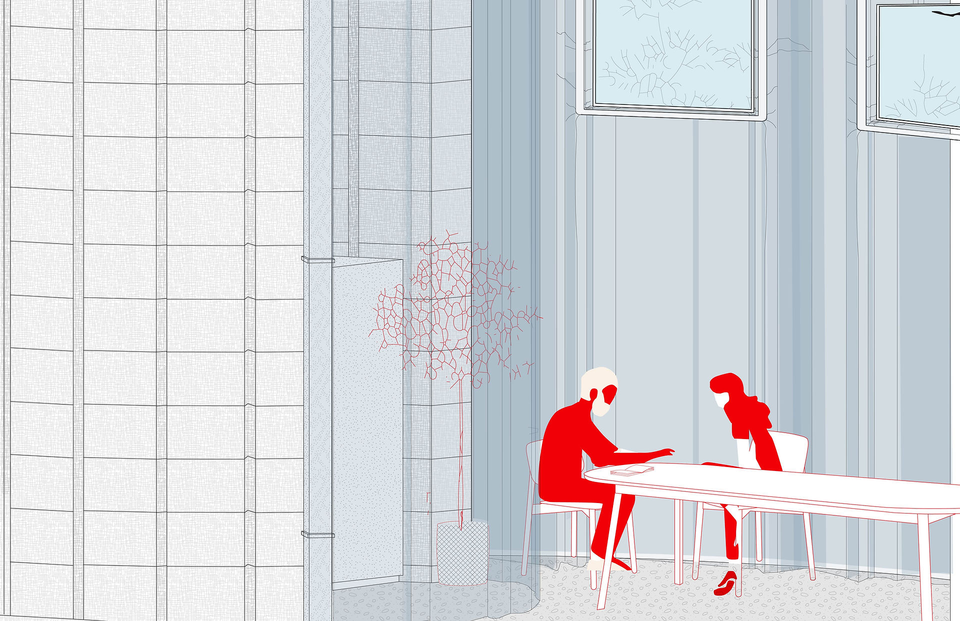 This project proposes an affordable housing template. The house is built in a perfect circle for a substantial passive heating and cooling system, as well as cutting costs on building materials. Water systems are stacked in a centralized core to allow for greywater re-use, and a composting toilet system. A sloped roof allows for rain collection, and a clip on rain-screen creates a perfect wall. Built with hempcrete, a sustainable CMU, clip on systems are integrated into each component of the house including, removable-washable-fabric walls, and an exterior cladding.